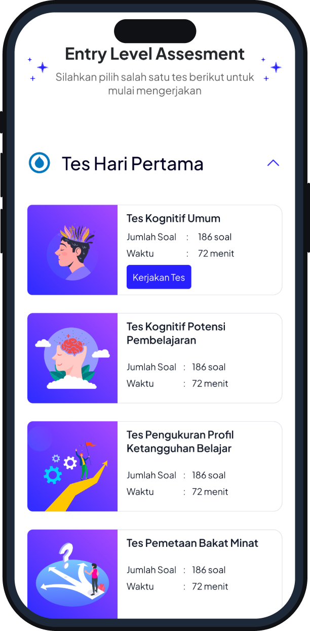 Entry Level Assessment (ELA) adalah asesmen diagnostik yang diperkaya untuk memetakan minat, potensi, gaya belajar, dan karakter siswa secara akurat, ilmiah, cepat, dan mudah. Hasilnya memberikan referensi rumpun belajar yang tepat untuk melanjutkan ke jenjang SMA/SMK, memandu pemilihan jurusan perguruan tinggi, sekaligus memetakan arah karir sehingga siswa siap dan percaya diri menghadapi masa depan.