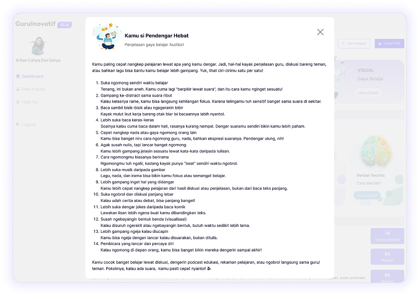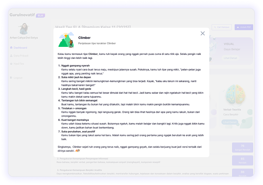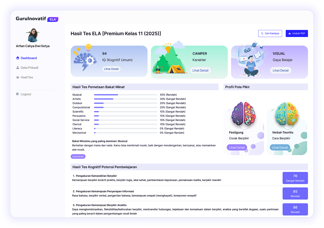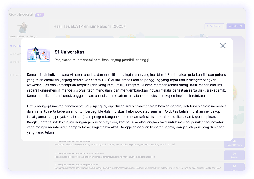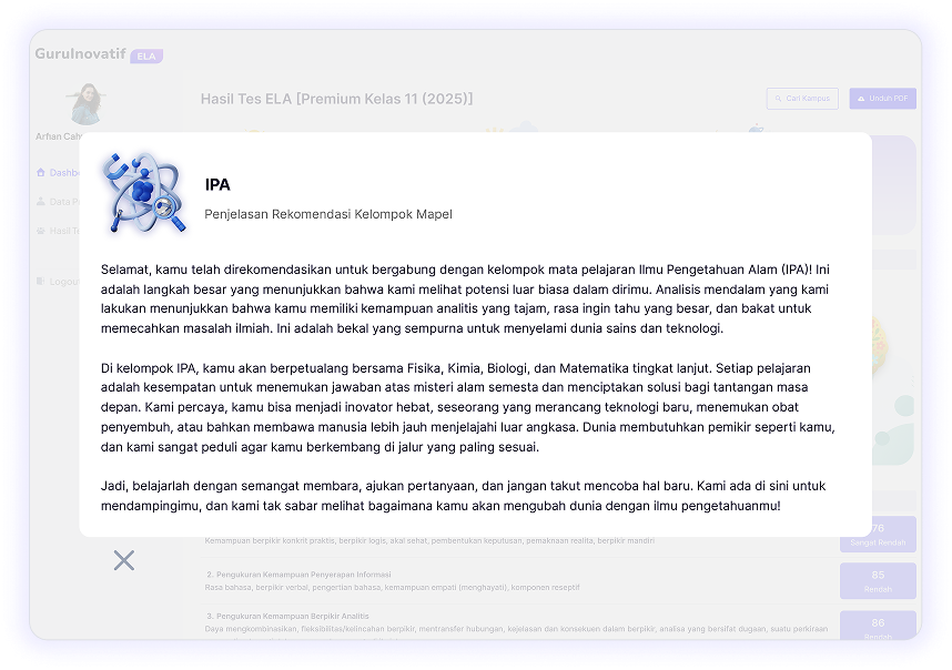 ELA memberikan rekomendasi kecocokan jurusan yang akurat untuk jalur peminatan (SMA/SMK, IPA/IPS/Bahasa) atau jurusan kuliah guna memastikan pilihan studi selaras dengan potensi dan kemampuan diri.
